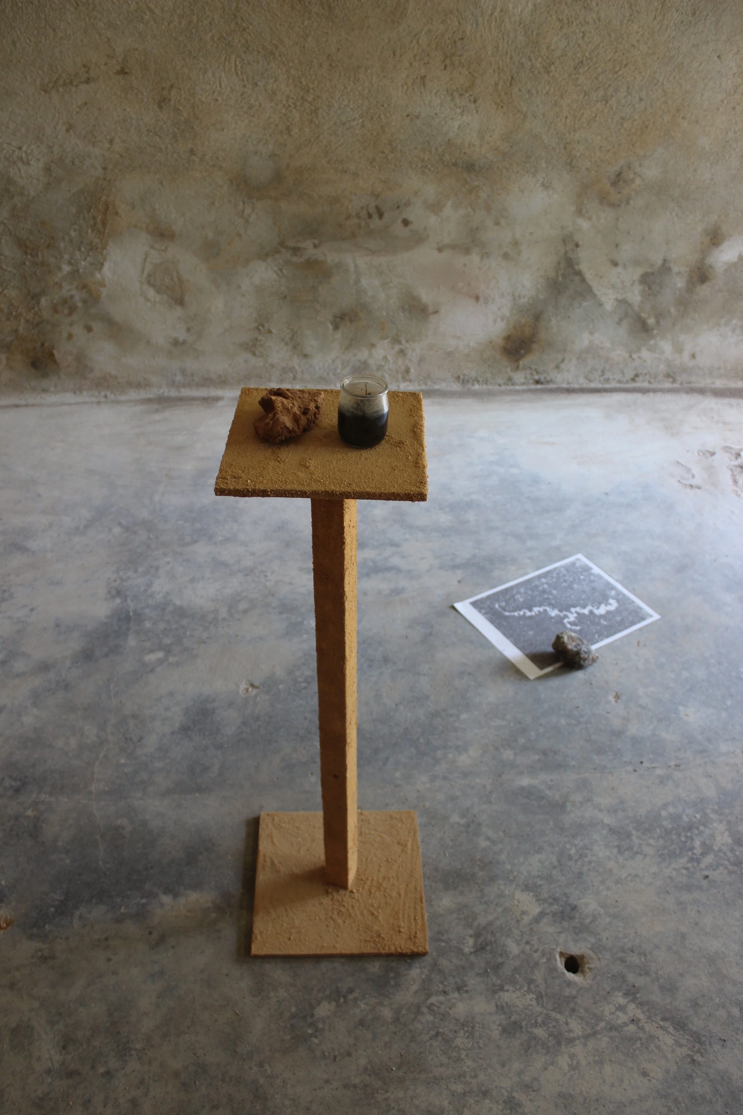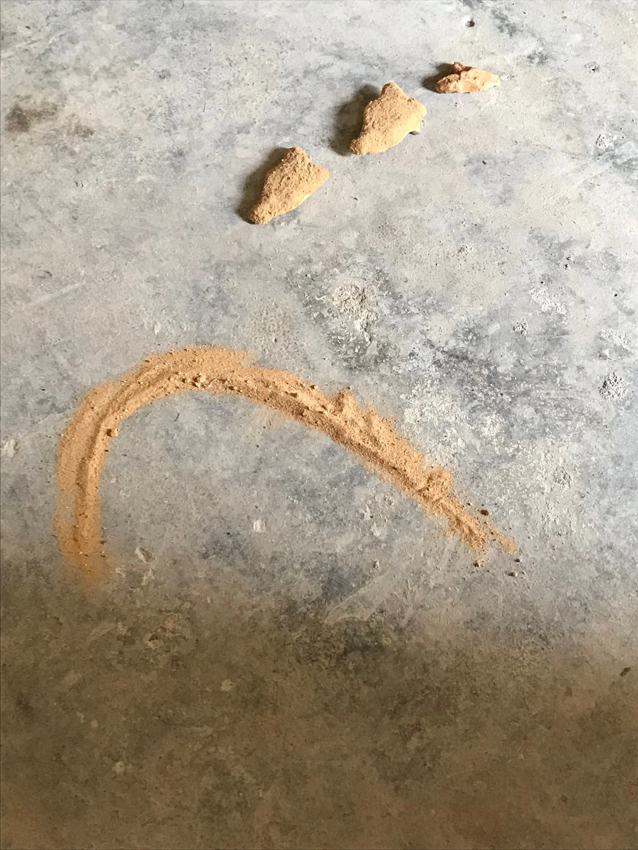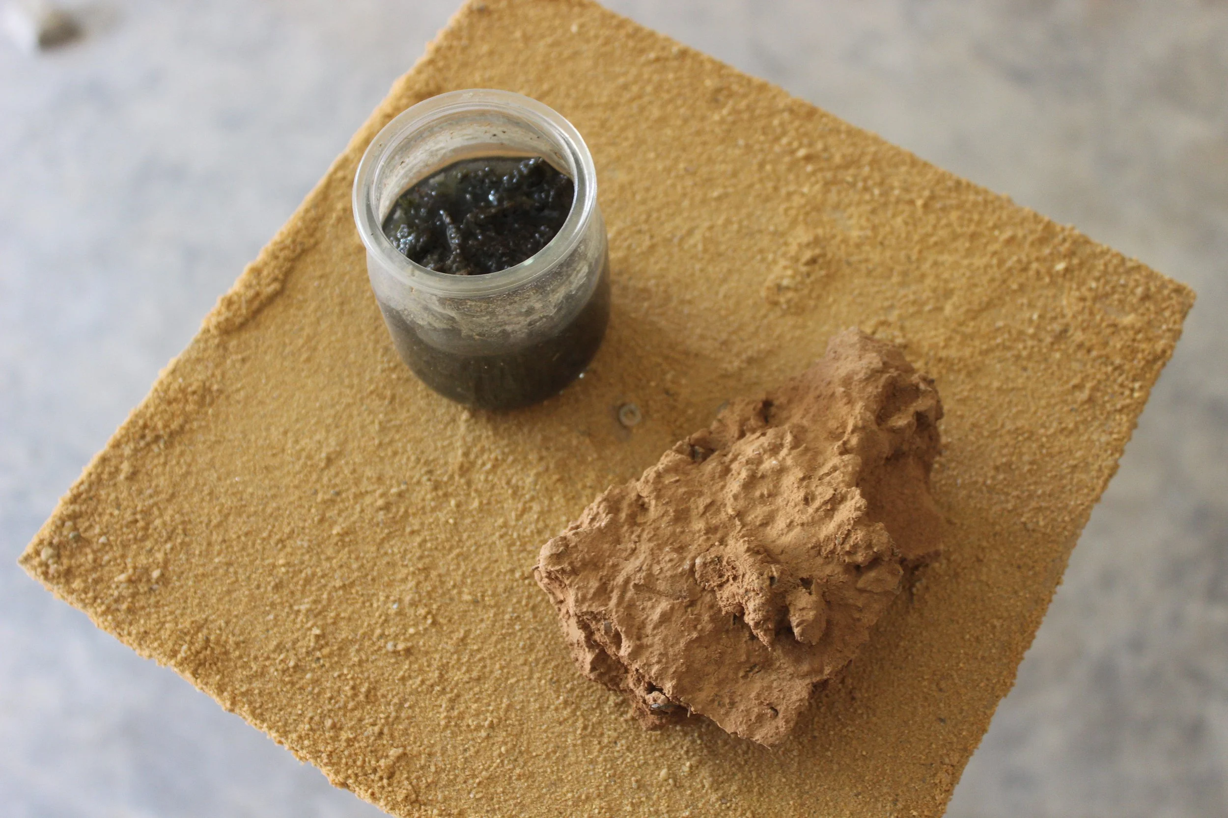 Builders sand, cement, cement n’ salt, gesso, suet (eaten by the dog), raw clay, found rocks, made rocks, print, moss dye (solar extraction), lucky coin, fragment of peacock ore crystal, bubblegum